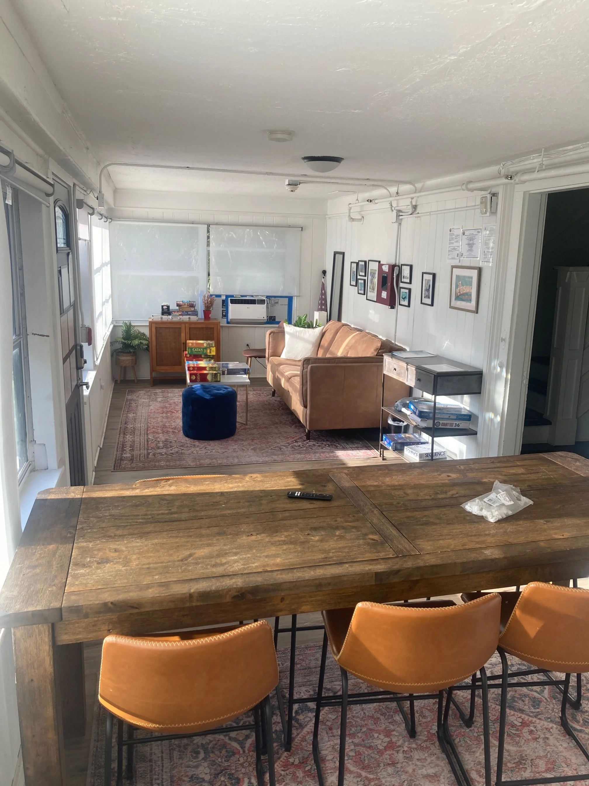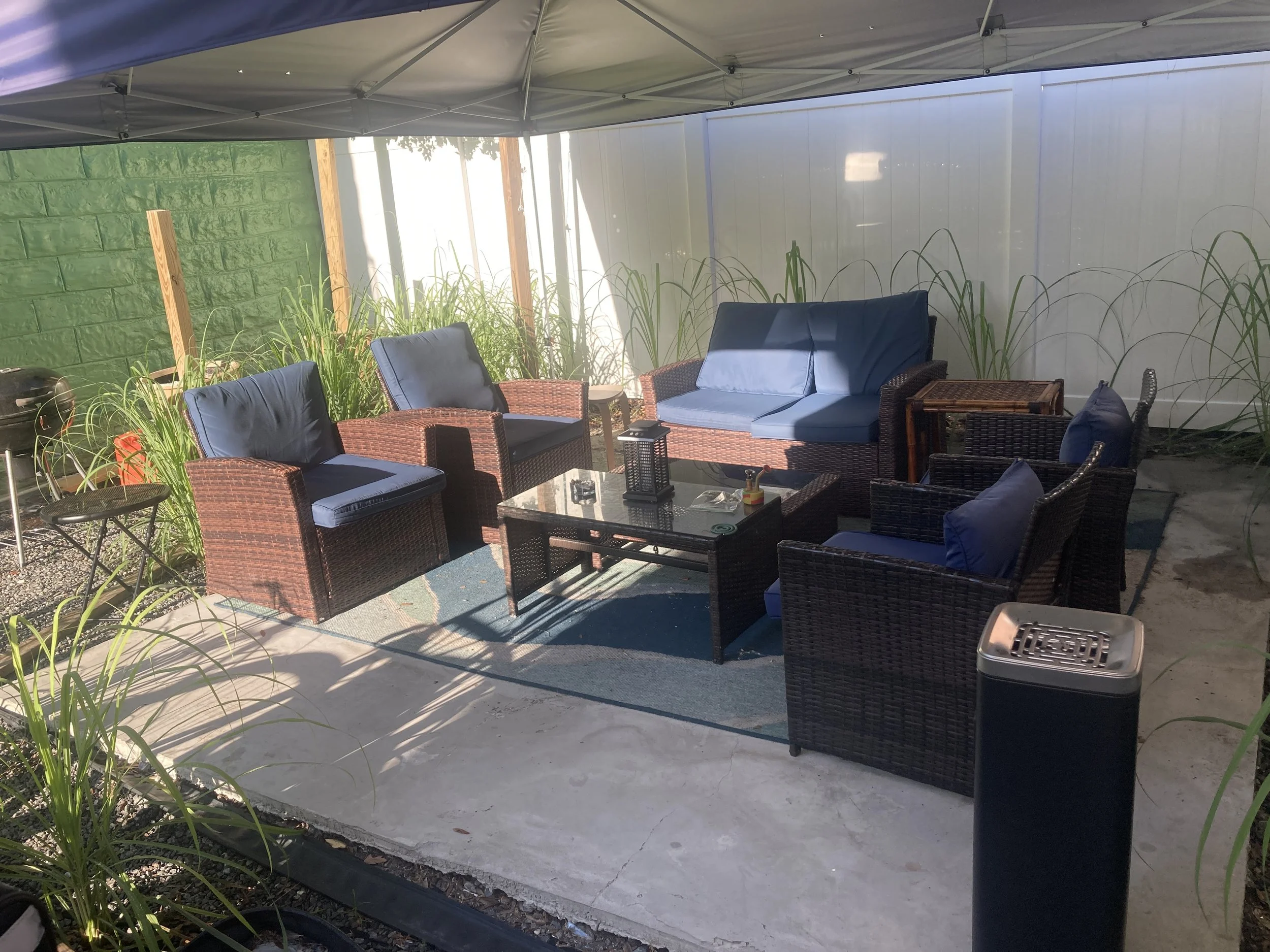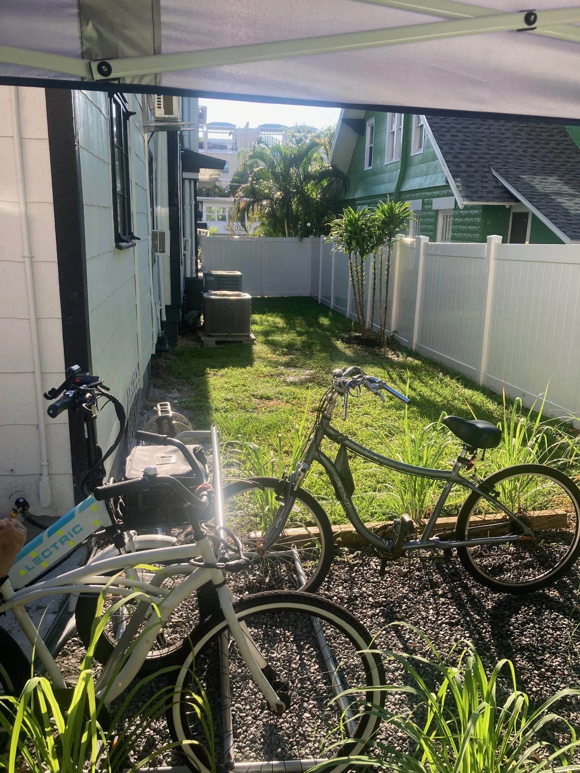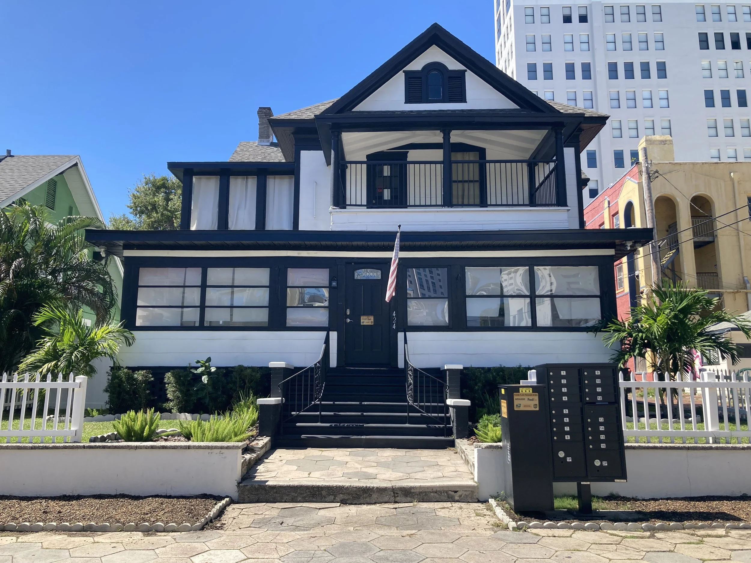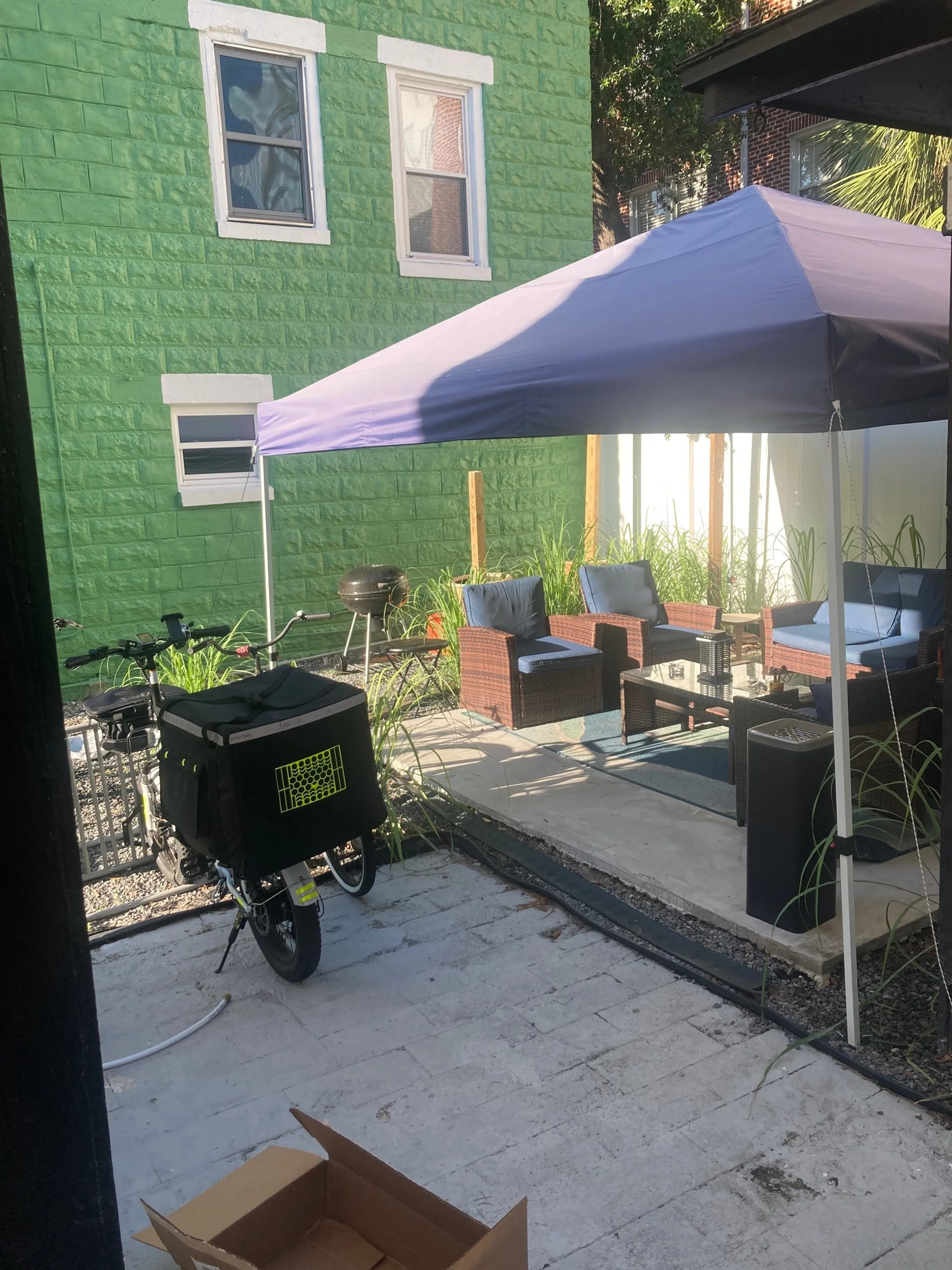 Located within Zone 1A of the Historic Downtown Saint Pete, our home has 15-units, some with private bathrooms and some without, 3 shared full bathrooms with showers, a large lobby with games and puzzles where we often host house game nights and pizza parties for all of our residents. There is a great tented area in the back yard with a barbecue and shaded seating, which comes in handy when it’s raining. As shown in the photo, we also have a balcony on the 2nd floor with a great view of the Saint Pete skyline, and there’s a dedicated Amazon/UPS/Delivery drop box attached to the USPS mailbox for safe deliveries.